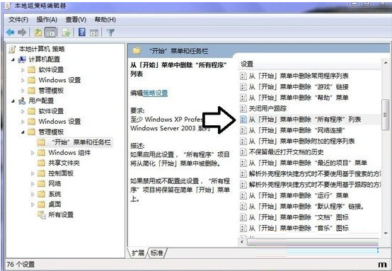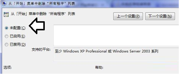 3、在右侧找到“从开端菜单中删除“所有程序列表””并双击打开,选择“未配置”点击利用并断定即可。