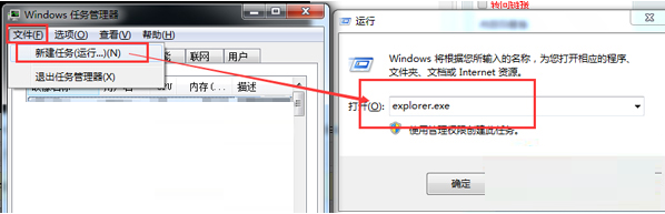 4、按下“ctrl+shift+esc”呼出任务管理器,点击文件—新建任务,输入“explorer.exe”按下回车键;