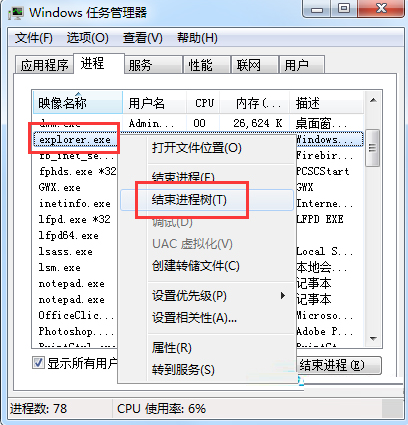 6、在任务管理器内找到“Explorer.exe”点击右键,选择结速过程;