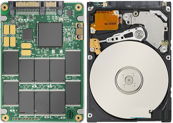 SSD固态硬盘(左)和HDD机械硬盘内部结构(右)