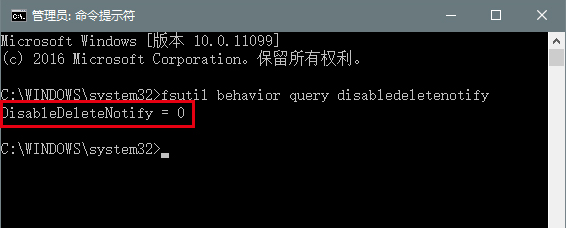2、履行如下命令:fsutil behavior set disabledeletenotify 0