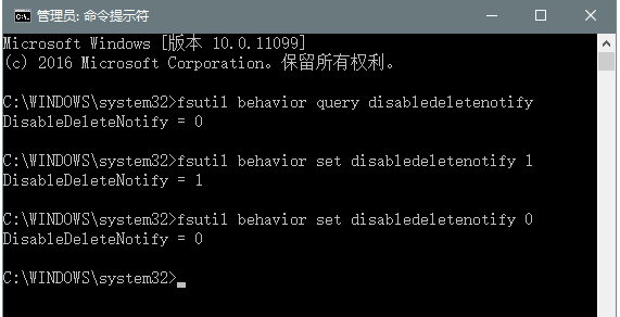 同理,若想关闭该功效,只需履行:fsutil behavior set disabledeletenotify 1
