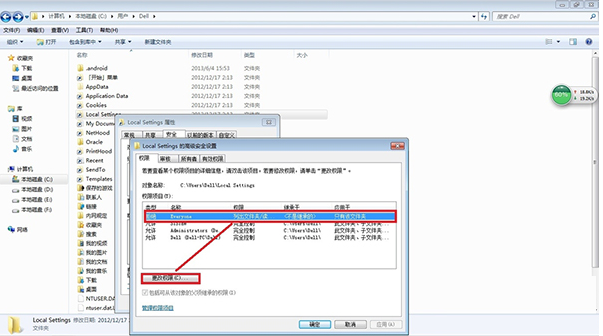 3、在Local Settings的高级安全设置窗口,选中Everyone(注意:类型为拒绝,阐明权限未开启),点击"更改权限",弹出权限窗口。