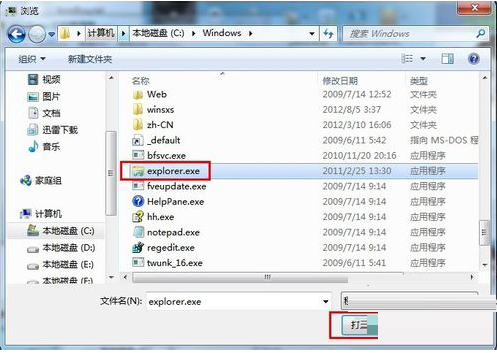 5、在出问题的机器上插入U盘,再打开“创立新任务”窗口,单击“浏览”按钮,浏览到Windows文件夹,在这里粘贴或调换explorer文件,然后选中explorer,单击“打开”按钮。