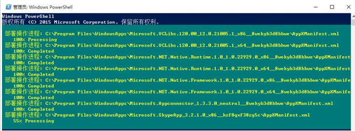 Get-AppXPackage -AllUsers | Foreach {Add-AppxPackage -DisableDevelopmentMode -Register “$($_.InstallLocation)\AppXManifest.xml”},并回车运行;