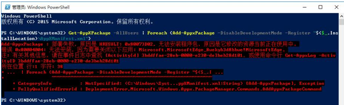 3、对于利用商店问题在Windows PowerShell(管理员)下履行命令: