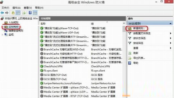 1、在把持面板中打开Windows防火墙,并点左侧的高级设置,打开后点左侧出站规矩,再点右侧新建规矩。