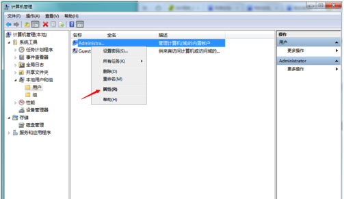 4、在右方用户列表中,右键点击【administrator】选择属性选项,如下图所示