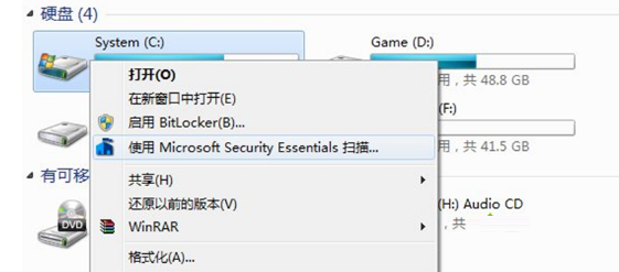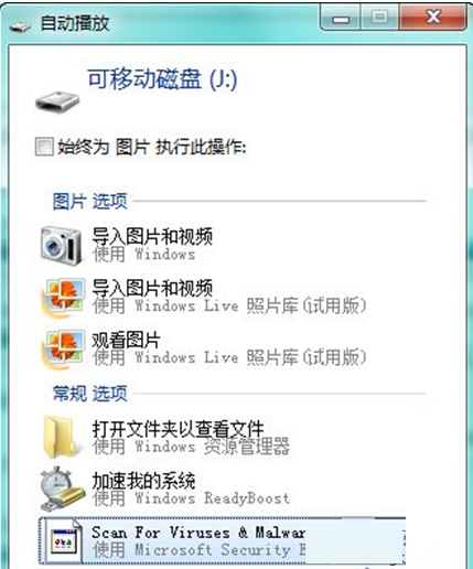 4、重新插入U盘后,惯例选项最下方就多出一项“Scan For Viruses Malware”,但是图标显示不正常,点击也无法调用MSE扫描,这是因为文件路径不匹配引起,还需下面操作。