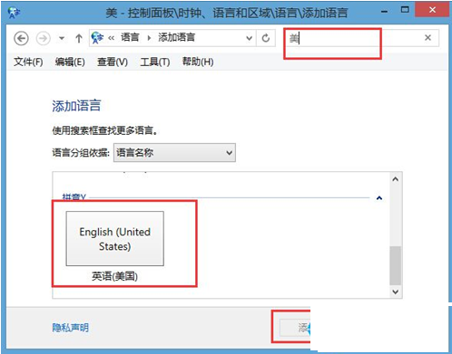 4、在语言列表中找到“英文(美国)”,也可以应用搜索,找到后选择并点击“添加”按钮;