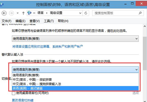 6、然后点击“高级设置”,进入后将替代默认输入法设置为“美式键盘”;