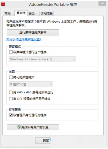 1、找到AdobeReaderPortable运行程序,右键→属性→兼容性,把“权限等级 以管理员身份运行此程序”打勾断定,再打开PDF文件,以上的对话框就不会再弹出。