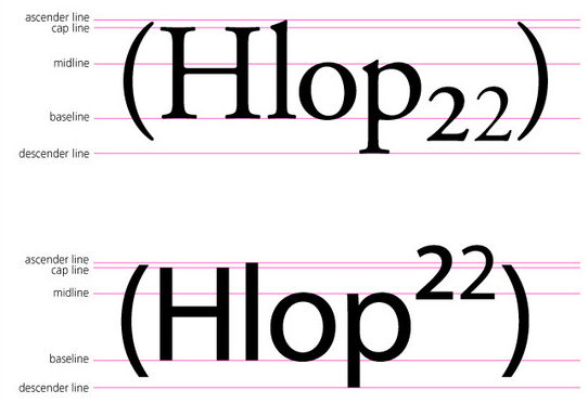 注意:如果你还可以应用「增大」(Raise)或「减小」(Lower)选项来达到进一步抬高上标和降低下标的目标。这样一来,相较于基线,某些字体将被更明显地区分出来。参考下图中「基线」、「上标」和「下标」的相对地位。