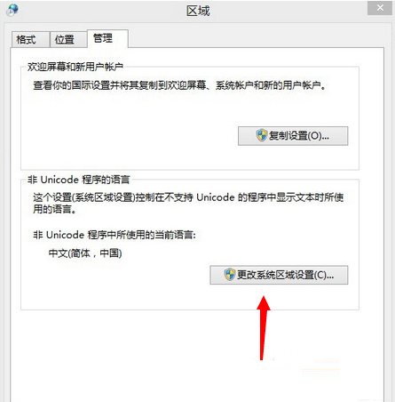 2、接着选择区域三个选项中的管理:然后选择Unicode区域改成日语,地位也改成日本;如下图所示
