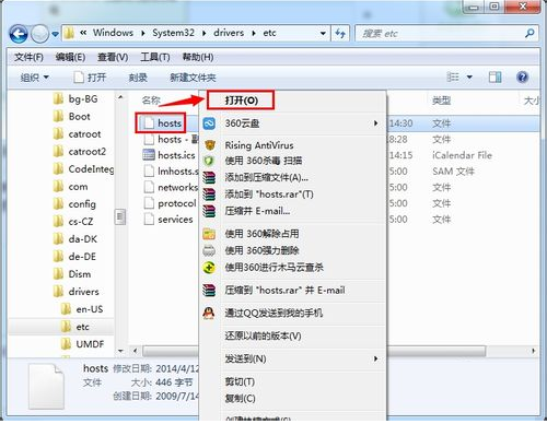 3、接着找到hosts文件,然后单击鼠标右键,在弹出的选项中点击用记事本打开,如下图所示: