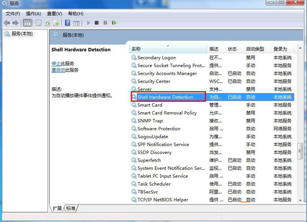 2、打开服务设置窗口后,在列表中找到并双击“Shell Hardware Detection”选项,如下图所示: