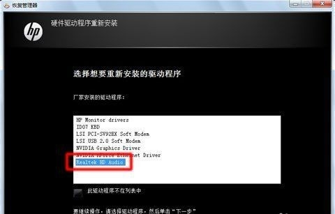 2、在“恢复管理器”窗口中,请您点击“硬件驱动程序重新安装”。