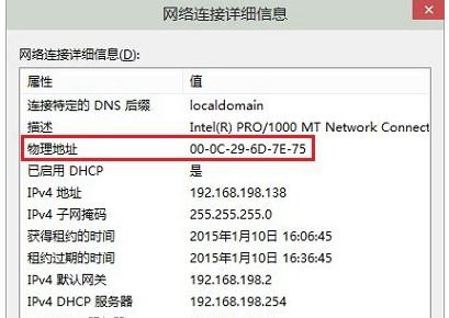 第四步、在“网络连接详细些信息”界面,我们看到的物理地址,就是我们要查看的MAC地址!