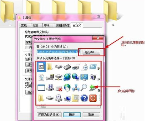 5、弹出新的窗口,请求我们自己选择爱好的(想要的)图标,其中可以应用系统自带的图标,也可以通过浏览选择自己筹备好的图标文件作为文件夹的图标。