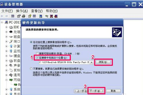 4,在下一窗口中,选择“在搜索中包含这个地位”,然后按“浏览”按钮,加载你筹备好的网卡驱动,然后按“下一步”,向导就会开端为你安装网卡的驱动程序。
