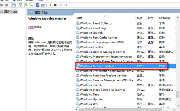 2、我们在服务(本地)窗口找到:Windows Modules Installer服务,查看是否被禁用;