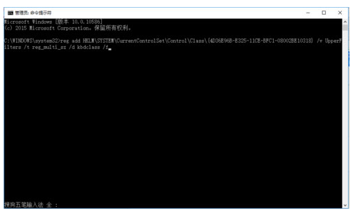 3、在CMD窗口里面输入reg add HKLM\SYSTEM\CurrentControlSet\Control\Class\{4D36E96B-E325-11CE-BFC1-08002BE10318} /v UpperFilters /t reg_multi_sz /d kbdclass /f;