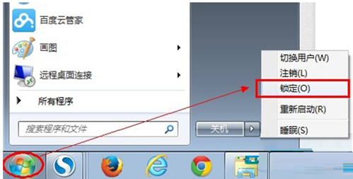 1、打开开端菜单,在关机按钮后面的三角按钮点击“锁定”可以实现锁屏;