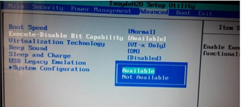 2、在Advanced中把Execute Disabled Bit设置为Enabled或Available,表现启动.