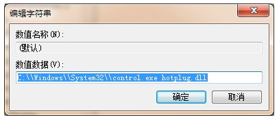 6、点击“command”项,,在窗口右侧双击打开“默认”字符串值,将其值修正为“C:\\Windows\\System32\\control.exe hotplug.dll”点击断定即可。