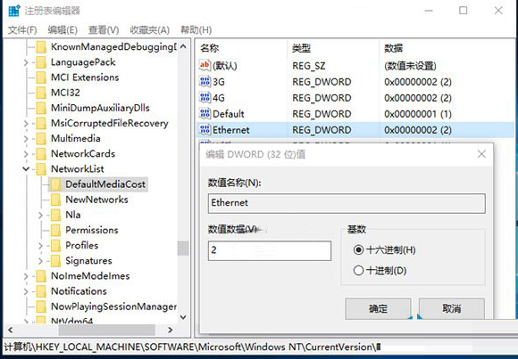 4、在右侧找到Ethernet,该项即为本地连接(以太网),双击,将其值修正为2;