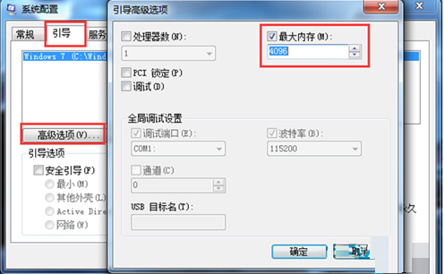 在运行中输入msconfig 回车后,在“领导”——“高级选项”中选择你的最大可用内存,断定并重启;