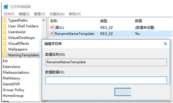 2、然后在Explorer项下新建NamingTemplates项。选中新建的NamingTemplates项,然后在右侧窗口中新建一个名为RenameNameTemplate的字符串值。