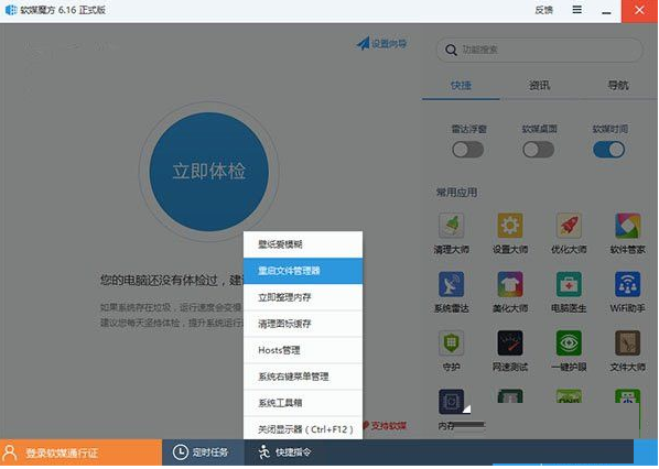 在任务管理器中找到“Windows资源管理器”,右键单击,选择“重新启动”。如果你安装了魔方的话,可以在主界面的快捷指令中快速重启资源管理器,如下图所示: