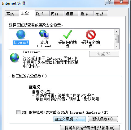 3、在安全选项卡中,最下面有一个该区域的安全级别这样一个选项,下面有一个自定义的级别,通常如果这里被更改,就会在上面显示一个自定义。