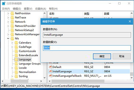 3、在右侧最底部找到名为InstallLanguage的注册表键值,该键值即代表系统的显示语言。我们要做的就是将其修正为想要升级到的系统语言代码即可。
