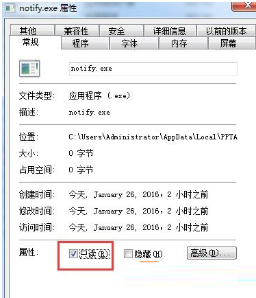 5、在“notify.exe”上单击右键,选择“属性”,在惯例选卡中勾选“只读”,最后点击利用并断定即可。
