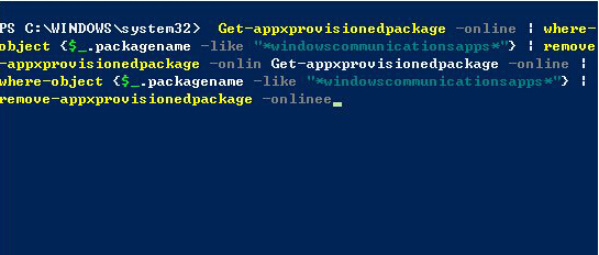 Get-appxprovisionedpackage –online | where-object {$_.packagename –like “*windowscommunicationsapps*”} | remove-appxprovisionedpackage –online