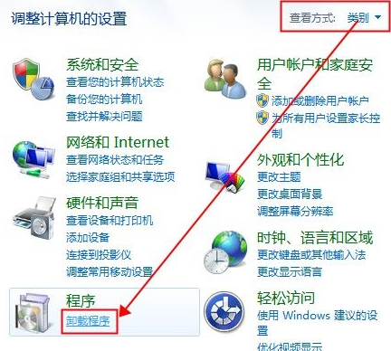 2、将把持面板中查看方法修正为“类别”;如下图所示