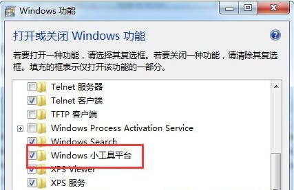 4、在“打开或关闭Windows功效”框内找到“Windows小工具平台”并将前面的勾打上勾,然后点击断定即可。如下图所示