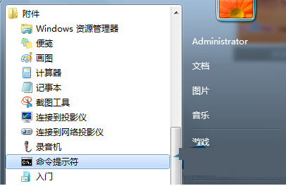 2、在附件里面找到命令提示符,直接将其打开。当然有的用户组不是管理员身份,鼠标右键点击命令提示符,接着就选择管理员身份运行。