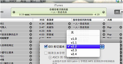 1、把系统语言改成中文,如果你的itune显示中文正常,command+A选择全部歌曲,右击,选择修正id3标签,然后如下图选择id3标记版本,在此选择的是V2.2,然后断定,这样就转变id3的版本到2.2版 。
