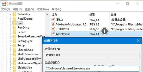 4、双击systray.exe键值,将其值修正为C:\Windows\System32\systray.exe,断定。