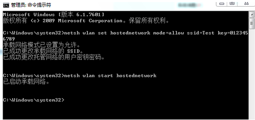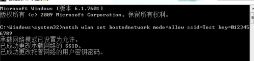 2、在“命令提示符”里输入“netsh wlan set hostednetwork mode=allow ssid=Test key=0123456789”,回车,系统会主动虚拟出一个wifi热门,如下图所示: