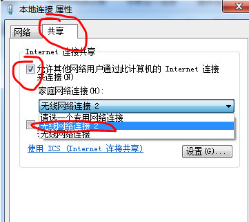 5、切换到“共享”,在第一个方框内打对勾,在下方的选择框内选择“无线连接2”,断定。如下图所示: