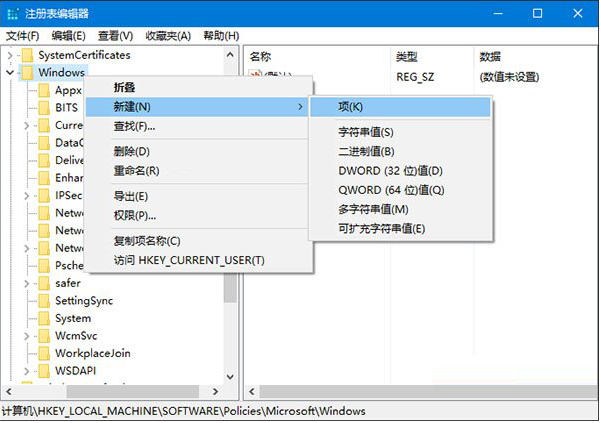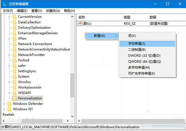 4、点击新建项,在右侧新建名为LockScreenImage的字符串值,如下图所示,这个值即代表默认锁屏壁纸的路径。