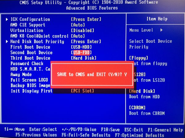 设置第一启动为:USB-HDD,设置完毕后按F10进行保存,弹出窗口后按回车键保存!