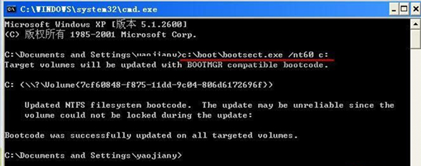 1、在XP系统中点击开端→运行,填入CMD命令然后按回车,在命令行窗口键入,c:\boot\bootsect.exe /nt60 c: 命令并按回车。
