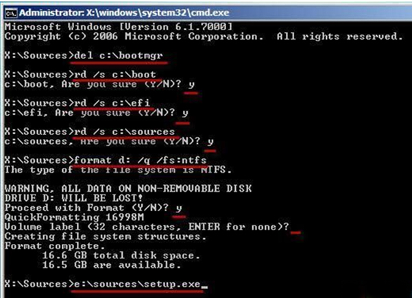 3、清算启动文件:为避免装Win7 时启动文件混乱导致失败,务必删除本来拷贝到C盘的bootmgr文件和boot、efi、sources文件夹。分辨在命令行窗口键入命令并按回车:
