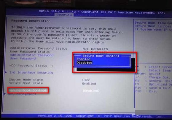 2、接着切换到Security标签,接着找到Secure BOOT Control,并且将Enabled改为Disabled即可。对于这一步的作用是关闭微软的Secure BOOT。对于这个功效开启会导致不能辨认U盘启动系统的安装。怎么重装电脑系统