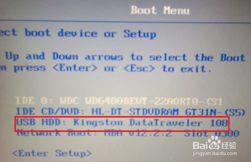 涌现“boot menu”窗口后,用键盘的高低键,选择“USB HDD:**********”(*******代表你的U盘品牌、型号等,例如我的是“Kingston DataTraveler 108”),接着按 “Enter”键进入就行啦;